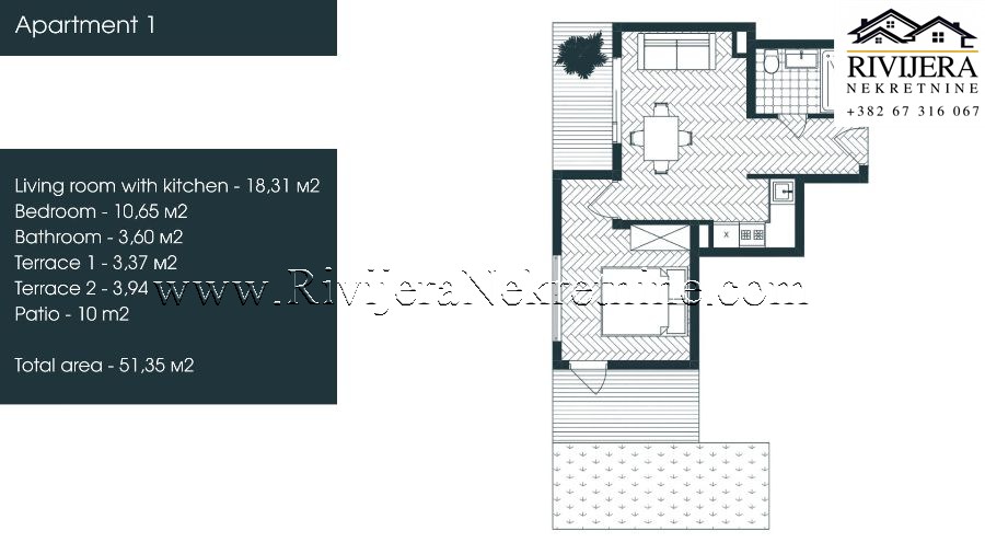 Prodaje se jednosoban stan u izgradnji povrsine 51m2, na prvom spratu u novom stambenom kompleksu koji se nalazi u jednom od najljepših dijelova Tivta. Stambeni kompleks se nalazi Donjoj Lastvi, u mirnom delu Tivta, okružen zelenilom i prestižnim rezidencijama.